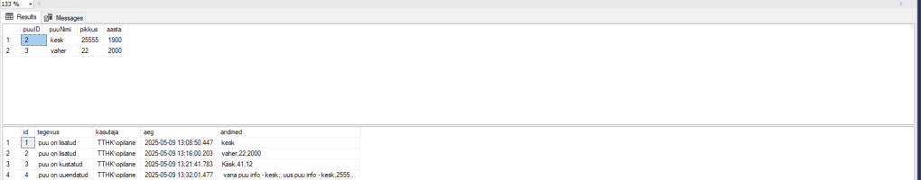 ‘ uus puu info – ‘, inserted.puuNimi, ‘,’ ,inserted.pikkus , ‘,’ ,inserted.aasta